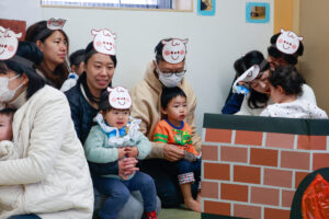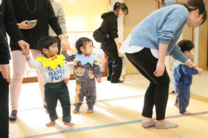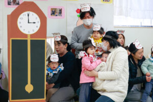初めての親子の広場では、クラスで行っているリトミックやエプロンシアターをしました。お家の人と一緒に「さんぽ」や「おんまはみんな」等に参加をして、子ども達は笑顔が多かったです。エプロンシアターで動物が出てくると一緒に手遊びをしたり、指をさしたり、動物にタッチをして喜んでいました。