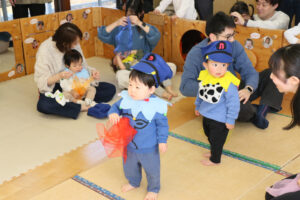 もも組さんはこのお話が大好きで「おおかみと七ひきのこやぎ」の劇ごっこをしました。保護者の方と一緒に時計の後ろに隠れたり、暖炉の後ろに隠れたりしました。見つかると「はーい」と元気よく返事をして可愛かったです。その後は色々な楽器に触れて音を鳴らして楽しみました!