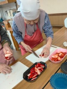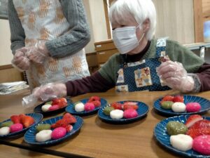 三色の豆腐白玉団子に、切ったいちごやあんこを盛り付けていただきました。どのように盛り付けるかを利用者同士で相談しながら取り組まれ、自然と会話も弾んでいました。