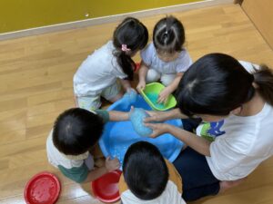 夏には待ちに待った水遊び・プール遊びでしたが今年も暑さが厳しく、実施回数は少なく…ですが、室内でもできる夏ならではの感触遊びを充実させ、夏の暑い時期も楽しく過ごせるよう工夫して活動してきました。