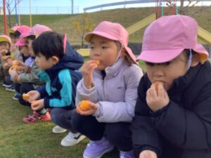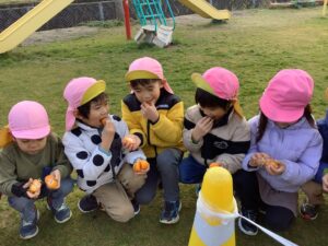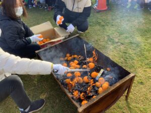 今年も健康に過ごせますように…子どもたちは焼きみかんを頬張ったり、炭で顔に