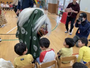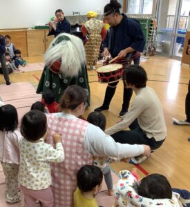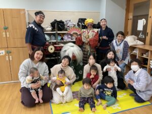 間近に見る獅子舞に子ども達は驚いて泣いてしまう姿もあれば、目を輝かせて拍手をしながら見入る姿が見られました。そして、「噛みつく=神様がつく、厄除けや無病息災を願うための意味が込められている」と言う話を聞いてから、頭を噛んでもらいました!