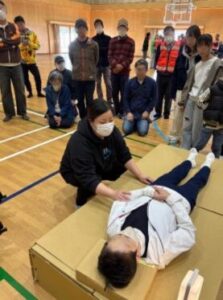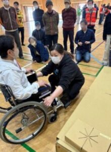 移乗体験の様子です。車椅子から簡易の段ボールベッドへの移乗方法を体験していただきました。