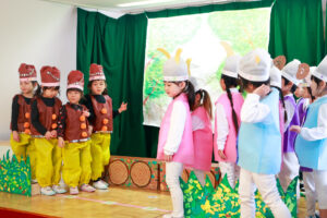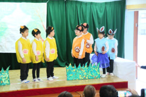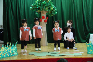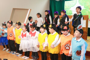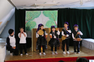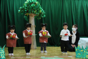 初めて舞台の上に立って「くまさんと大きな葉っぱ」の劇をしました。大きな舞台の上では緊張もありましたが、先生からの声掛けにも上手に応えて、葉っぱを傘にしたり、食べたり、リンゴを運んだりしました。最後は全員でカスタネットを叩いて上手な森のくまさんの演奏が出来ました。