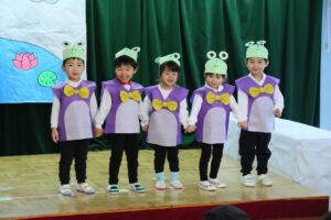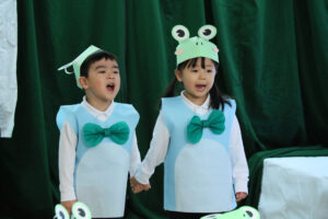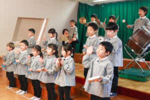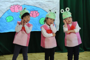 「かえるののどじまん」のペープサートを見てこのお話が気に入り、「きんこんかえるの のどじまん」の劇をすることになりました。色々なカエルになりきり「はあ、がっくし…」の表現がとても可愛くて子ども達も上手に演じていました。最後の合奏はトライアングル、すず、タンブリンの楽器を先生の指揮を見て上手に叩いていました。