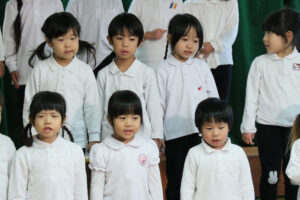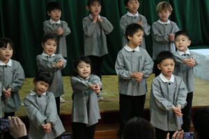 ひまわり組は合奏、合唱、劇の3つをやりました。合奏の「世界中の子どもたちが」では、沢山の楽器があるので音を1つにするのは難しいのですが、個々に練習をしながら音を合わせて頑張りました。合唱は「せかいがひとつになるまで」を歌いました。サビの所は手話の意味を理解して表現しました。劇は「ブレーメンの音楽隊」を演じました。盗賊や動物になりきって楽しそうに演じていました。最後の発表会は年長児らしく頼もしかったです。