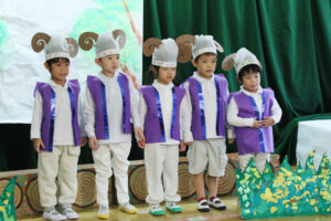 合唱は「そうだったらいいのにな」をみんなで決めて歌いました。歌いながらの振り付けも子ども達が考えて真剣に歌っていました。劇は「3びきのやぎのがらがらどん」です。トロルとやぎの両方の気持ちの立場になり、色々な感想が出てきたのでこの劇に決めました。去年よりもセリフが多かったのですが、自分たちで役や振りを決め、その役になりきって楽しそうに演じていました。元気いっぱいの、はいびすかす組でした。