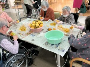 秋の深まりとともに、通所リハビリテーションいなば幸朋苑では「干し柿づくり」を行いました。