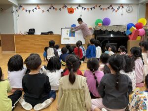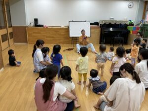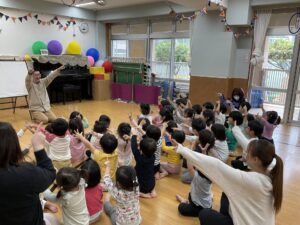 当日は『0歳・1歳・ケンケン広場の部/2歳・3歳の部/4歳・5歳の部』という3部制に分け、発達に合わせた動きを取り入れながら楽しく体を動かしたりパネルシアターを見たりしました。初めて会う荒巻シャケ先生に、目を輝かせながら笑顔で参加していた子ども達でした。