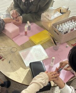 キッズネイル体験会の様子です♪プロのネイリストの方に来ていただき、子どもたちの小さな爪を好きな色やシールでかわいくしてもらいました。予約枠がすぐに埋まるほどの大人気イベントでした!
