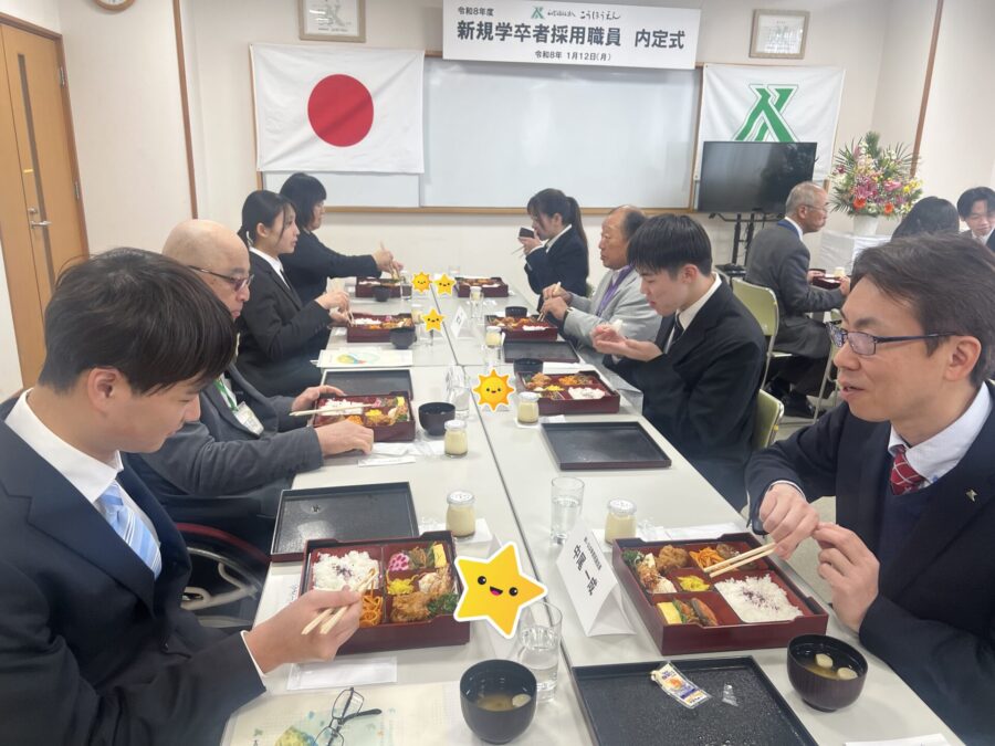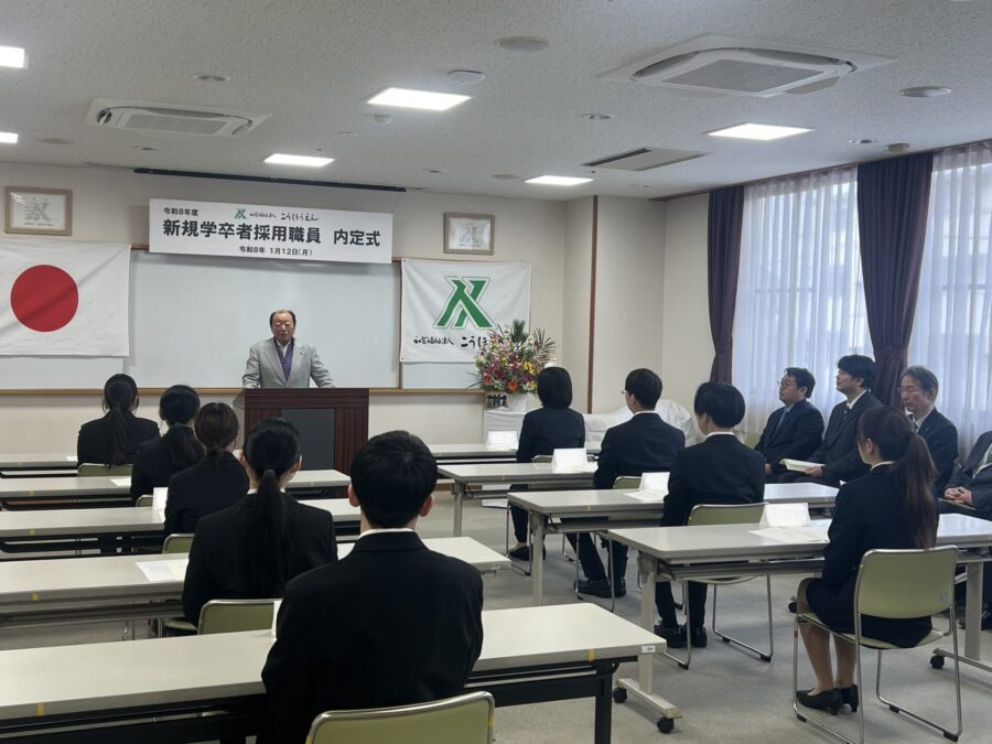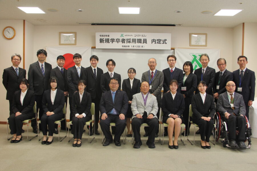 2026年1月12日 令和8年度新規学卒者採用職員内定式(鳥取地区)をアザレアコートこうほうえんにて開催し、内定者9名が出席しました。