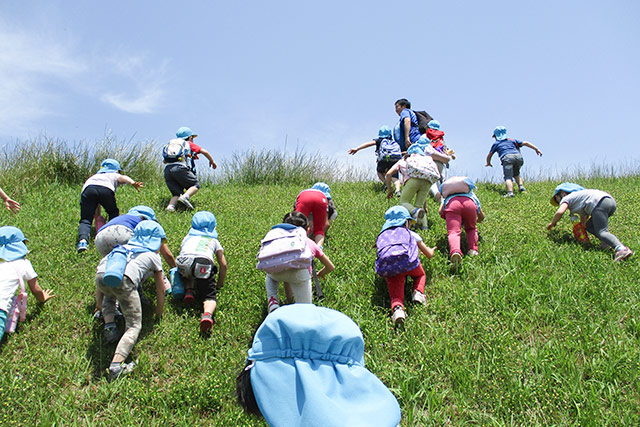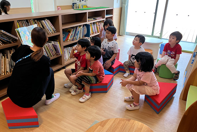 絵本が、1,300冊程あります。絵本コーナーは、各クラスのの他3か所にあり、特に2階の絵本コーナー(30㎡)には子どもが自由に絵本を選べる環境を作っています。