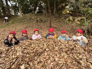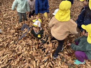 さくら並木公園までお散歩に行きました。枯葉がたくさん落ちていて山のようになっていたので、中に足を入れてみたり寝転がってみたりして感触を楽しんでいました。落ち葉をお金やアクセサリー、宝物に見立てて楽しむ姿もありました。