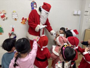 サンタさんが保育園にプレゼントを持って来てくれました!最後にはみんなでハイタッチをしてバイバイするたんぽぽ組さんです!