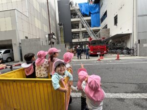 みんなが大好きな消防車を見に行くと、なんと訓練中!!梯子消防車や大迫力の放水訓練の様子に大興奮でした!