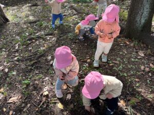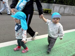 すっかり歩くことが上手になり、保育士と手を繋いで歩くことを喜んでいます!歩きながらも道に落ちている葉っぱや石に興味津々な子どもたちです。