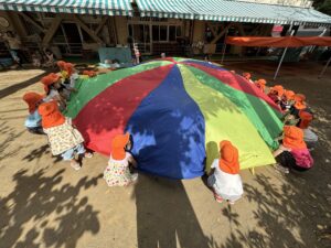 運動会に向けてパラバルーンにも挑戦しています!「せーの」と掛け声に合わせて上に持ち上げたり、バルーンの中に隠れたりと、楽しみながら取り組みました!