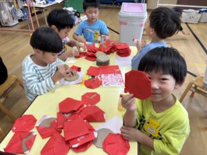 お店屋さんごっこの準備が着々と進んでいます。意欲的に取り組む子ども達、「早くお買い物をしたい!」と期待を持って取り組んでいます。