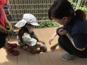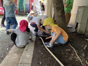 広い園庭のすみっこでは、土を掘り返したり植木鉢の下をのぞいたりして虫探しに夢中な子たちもいます。