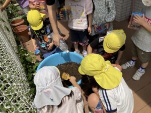 4歳児は夏に向けてペットボトル製のプランターに‶ひまわりの種″を植えました。自分だけの‶プランター”に大切そうに種をまいていました。