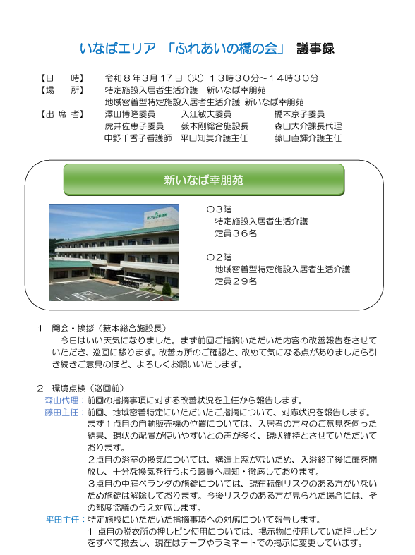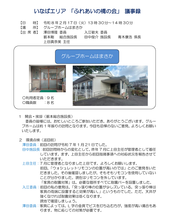 外部委員は、民生児童委員や自治会、施設ボランティアなど地域の代表で構成し、利用者の生活状況や職員の利用者への関わり方、施設環境などを見学していただき、提案されたご意見を多くの改善に繋げてきました。