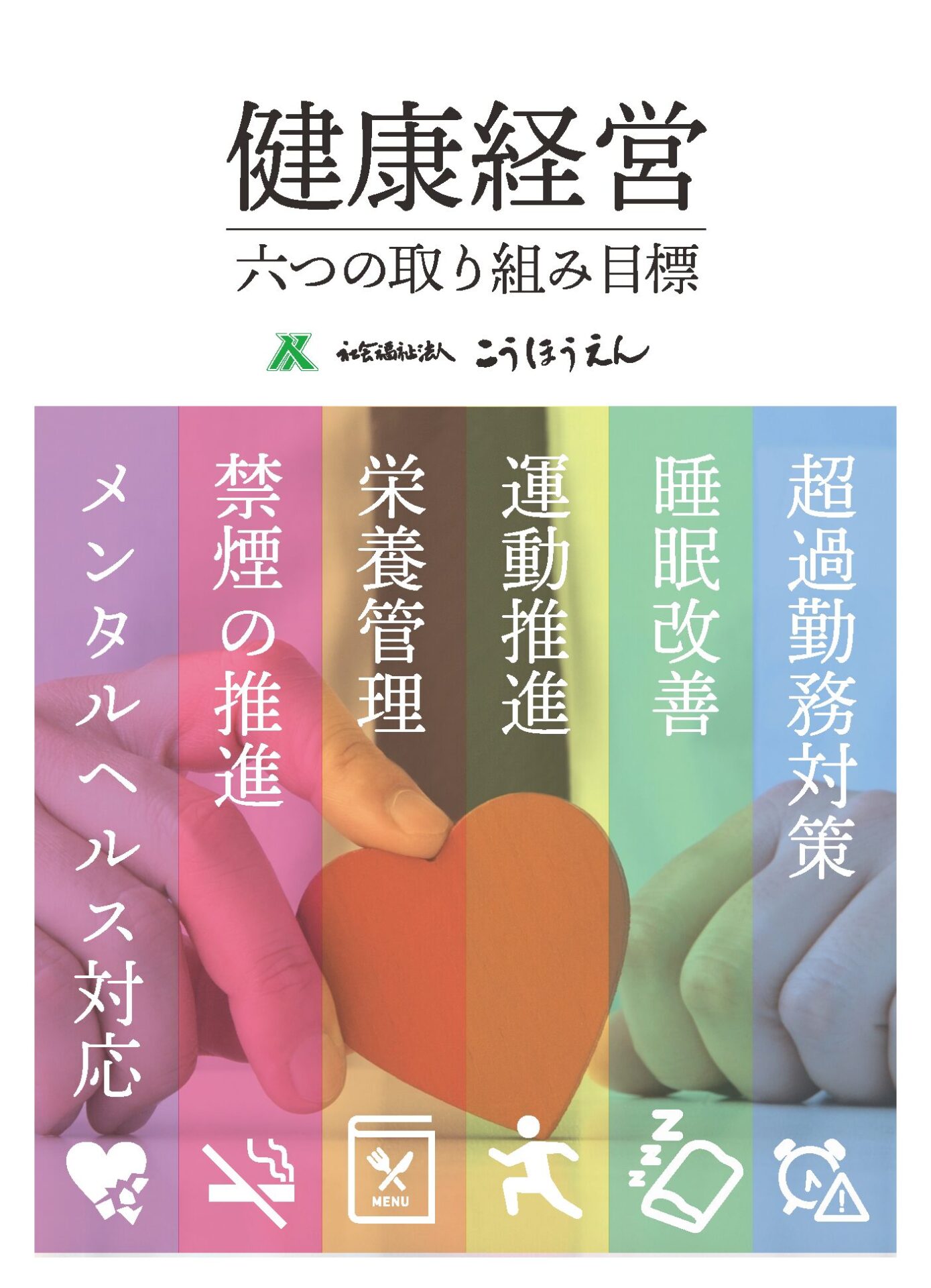 社会福祉法人こうほうえんでは、2022年に「健康経営宣言」を行い、健康経営 に取り組んでいるところです。地域に開かれ、地域に愛され、地域に信頼される法人を目指す理念に基づき、持続可能な企業運営を行うためには、当法人だけでなくお取引先の共存共栄が不可欠だと考えています。 こういった考えをお取引先様にもお伝えするため、本ガイドラインを策定いたしました。