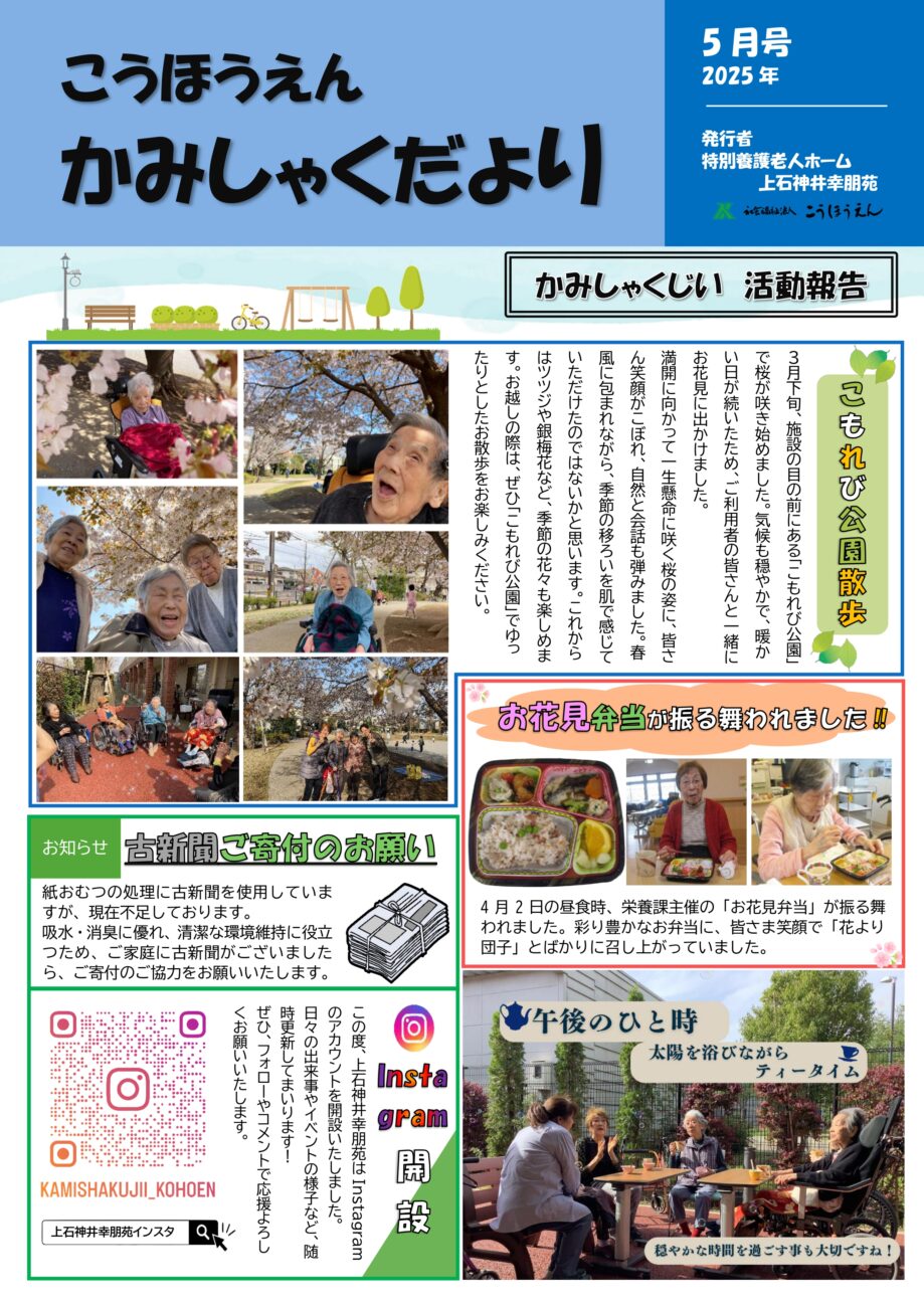 上石神井幸朋苑では、毎月「広報誌」を発行しております。施設での出来事や日々の様子、イベントの報告など、ご利用者様やご家族の皆様に笑顔をお届けする内容が満載です。私たちの日常を少しのぞいてみませんか?ぜひご覧ください!