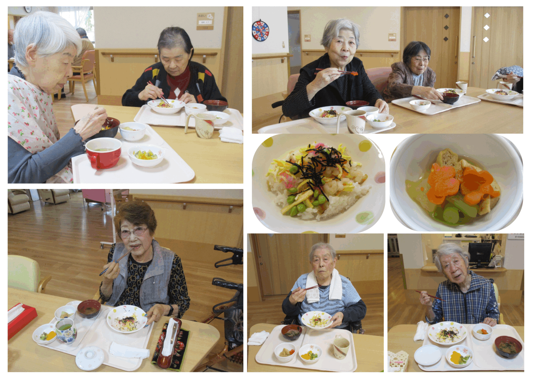 上石神井幸朋苑では、5月11日に栄養課主催 母の日のイベントとして、色とりどりのちらし寿司が振る舞われました。