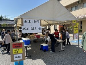 屋台コーナーでは、まつりには欠かせないたい焼き・たこ焼き(山田商店さん)、その他にも洋菓子(パティスリーキキさん)、和菓子(成谷湖月堂さん)、焼き菓子(あぷりこさん)の甘い香りが漂い、さらにインドネシア料理(よなご幸朋苑職員)のスパイシーな味わいも楽しめるなど、多彩なグルメが並びました。ご利用者をはじめ、ご家族や地域の皆さまにも大変ご好評をいただきました。
