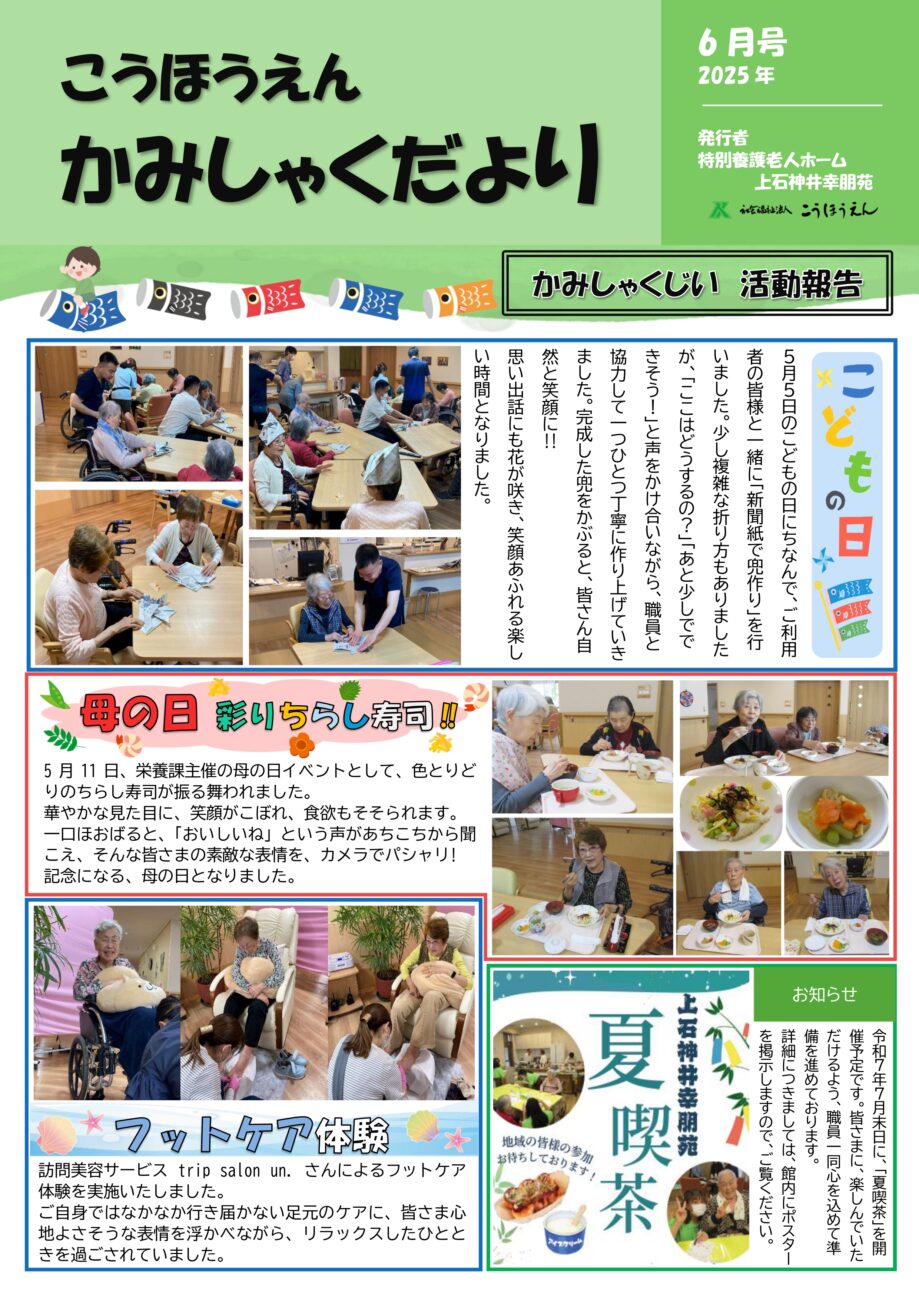 上石神井幸朋苑では、毎月「広報誌」を発行しております。施設での出来事や日々の様子、イベントの報告など、ご利用者様やご家族の皆様に笑顔をお届けする内容が満載です。私たちの日常を少しのぞいてみませんか?ぜひご覧ください!