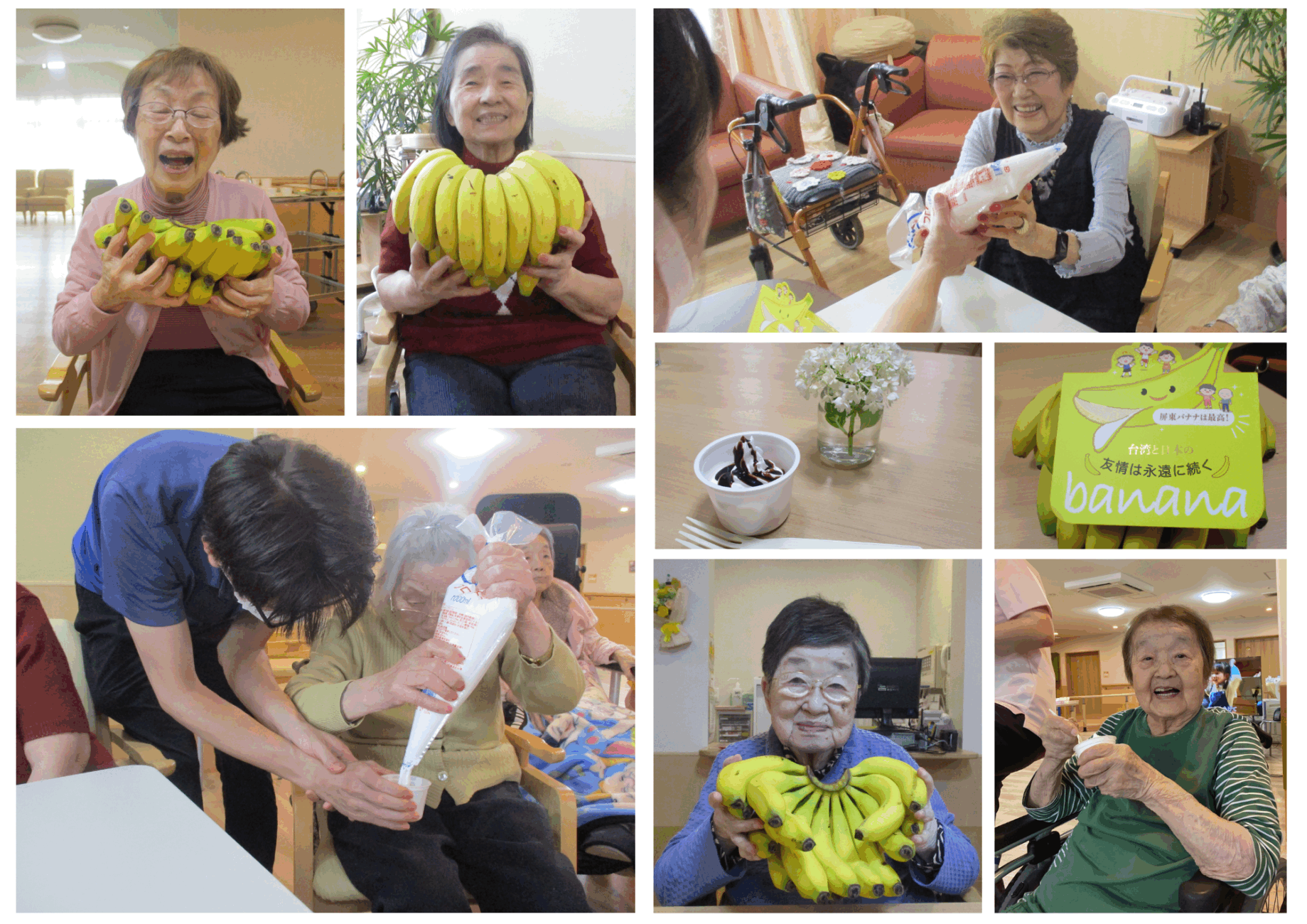立派なバナナに、驚きの声や笑顔がこぼれる場面もみられ、ご利用者の皆さまには、バナナのデコレーションを楽しんでいただきました。