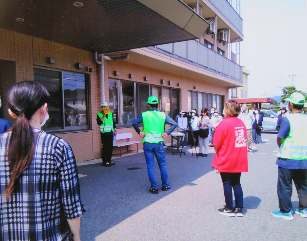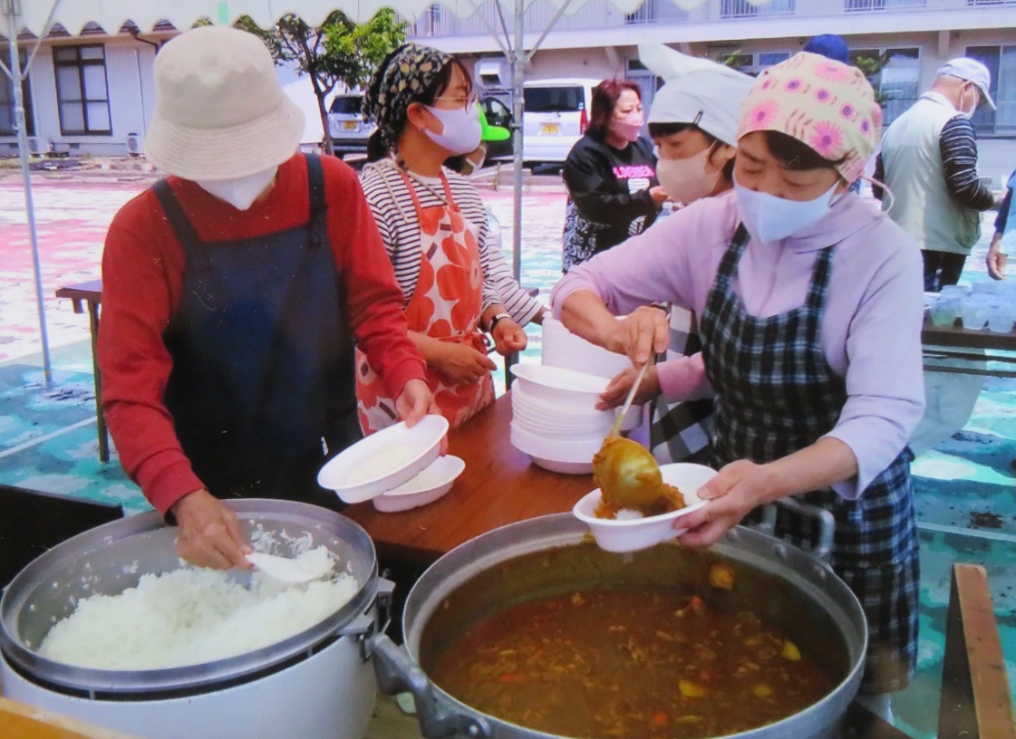 火災や地震、津波の発生時の訓練は、ご利用者と地域住民、職員の安全を確保する目的で取り組んでいます。訓練内容は、火災訓練では地域の方が放送を聞いて駆け付け、ご利用者の避難誘導の協力、職員は初期消火、災害時の屋上へ避難する経路の確認、情報伝達など実際の災害を想定し実施しています。避難誘導後に、地域住民が主体となり炊き出し(カレーライス)を行いました。