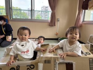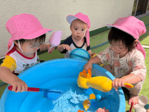 6月から水遊びが始まりました!魚の玩具をシャベルですくったり、バケツの水を浴びたりして気持ちよさそうに遊んでいました。