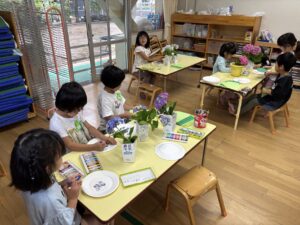 保育園で咲いた紫陽花を見ながら、紫陽花時計を作りました。花びらの形や色を観察しながら作り上げていました!