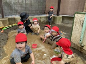 園庭で泥遊びをしました。砂場まで樋を繋げて『泥温泉』を作るとその中へ座り、バケツに水を入れたり、電車を「おみずにはいりまーす!」と走らせて楽しんでいました。