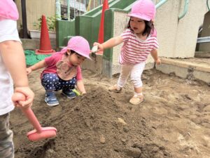 みんなで協力してお山づくり!沢山の砂を高く盛って「おおきい!」と大興奮の子どもたちでした。