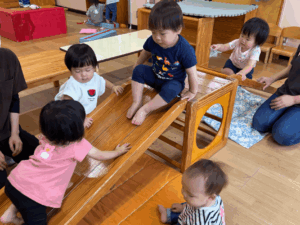 雨や暑さで外に出られない日でも、室内で巧技台のはしごや滑り台に挑戦して、元気に身体を動かしています。