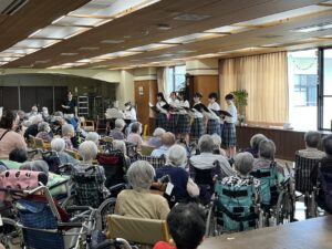 昨年に引き続き、今年度も米子高校UTA同好会の学生、先生に来苑頂き歌を披露していただきました。 テスト明けの日ではありましたが、素敵な歌声とハモリで会場を盛り上げて頂きました。 次回は秋頃を予定されていますので、さらなるパワーアップを期待してお待ちしております。