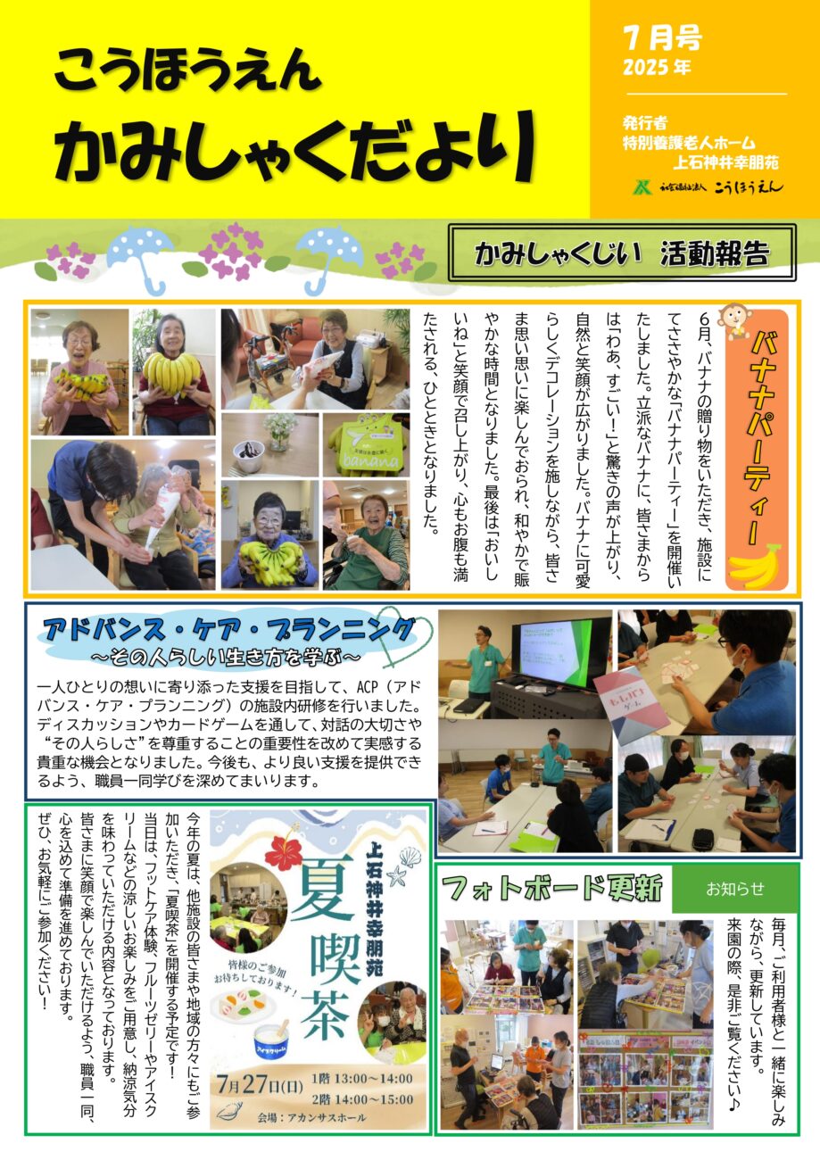 上石神井幸朋苑では、毎月「広報誌」を発行しております。施設での出来事や日々の様子、イベントの報告など、ご利用者様やご家族の皆様に笑顔をお届けする内容が満載です。私たちの日常を少しのぞいてみませんか?ぜひご覧ください!