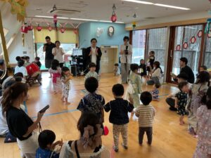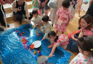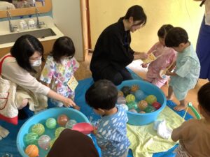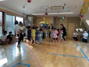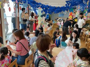 7月7日は保育園の七夕まつりでした。午前中は七夕の会をして、午後からは保護者も一緒に参加をしました。屋台では飲み物を飲んだり、ポテトやウインナーを食べました。ゲームにも参加をしてヨーヨー釣りや金魚すくい、輪投げ等楽しんでいました。ホールではアンパンマン音頭やピーマンマン体操の盆踊りを楽しみました。毎朝保育園で踊っていたので、張り切って踊る子や恥ずかしそうにしている子など様々でした。