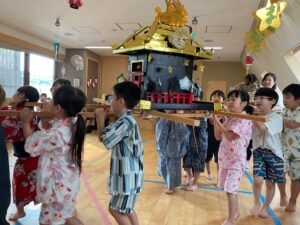 最後は5歳児のひまわり組がお神輿を担ぎました。みんなで力を合わせて「わっしょい、わっしょい」と声を掛けながら頑張っていました。