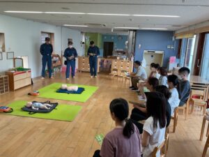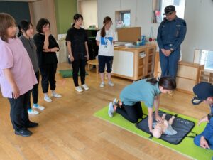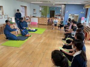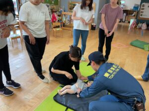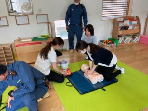 消防士さんから赤ちゃんや幼児向けの応急救護のやり方を聞いて、人形を使って実践しました。職員で協力をしながら心臓マッサージをしたり、AEDを使いました。今日学んだ事を忘れずに、日々の保育も安全に過ごせるように努力していきたいと思います。