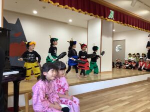 4歳児は「ももたろう」です。すっかり自分の役を覚えて役になりきっている姿が印象的な子どもたち。前日には「緊張するよ~」「パパとママが見に来てくれるんだ~」などと話していて、緊張と楽しみが入り混じった様子でしたが、当日は堂々と舞台に立ち、演じることを楽しんでいました。