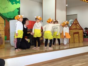 3歳児は「3びきのこぶた」です。前日まで、お休みの子がいたり違う役をやりたい!と言う子がいたりして、担任たちは気をもむ場面もありましたが・・・本番は大成功!保護者の方が見てくださっていることがうれしくて、にこにこしながら舞台に立っていました。手を振ったり話しかけたりするほど、余裕な子もいました。