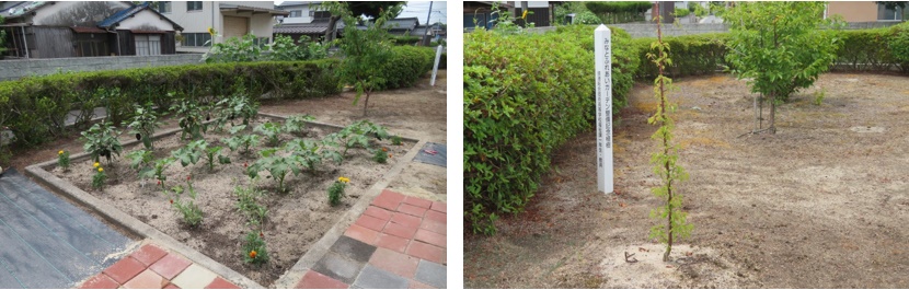 ナスやオクラが成長しています 境港総合技術高校福祉課1年生・教員による整備記念植樹