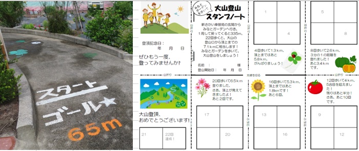 スタンプノートは、各事業所の玄関からガーデンを一周して戻るまでの距離を計算し、大山登山片道7.1kmで割って回数を出しています。所定回数歩けば、登山口から大山の頂上まで登ったということになります。