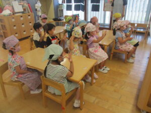 お家の方に用意していただいたエプロンと三角巾を身に付け、それだけでも気持ちがウキウキ♡してきます。高まる気持ちをグッと押さえて真剣に話を聞きました。説明を聞いた後、半分に切ったピーマンから自分達で種を取り出し、中にチーズとケチャップを入れてホットプレートで蒸し焼きにしました。とっても美味しく出来上がりました。