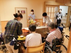 式典の後はお茶会を開き、ご利用者や職員で抹茶を点て、練りきりと一緒に美味しくいただきました。