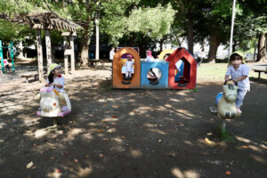 ちゅうりっぷ組の子ども達にとっては初めての遠足です。遠足経験者のはいびすかす組のお兄さん、お姉さんが公園まで一緒に手を繋いで歩いてくれて、公園でも一緒に遊び、楽しい時間を過ごしました。