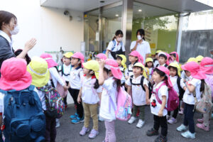 出発前にお約束の確認です。「お友だちとしっかり手を繋いで歩くこと」「先生のお話をよく聞くこと」「困ったことがあったら先生やお友だちにお話すること」…みんな、真剣に話を聞いています。